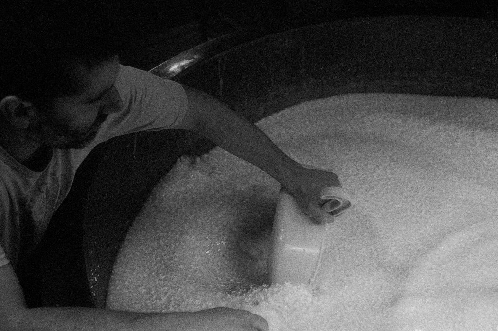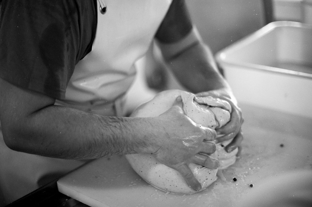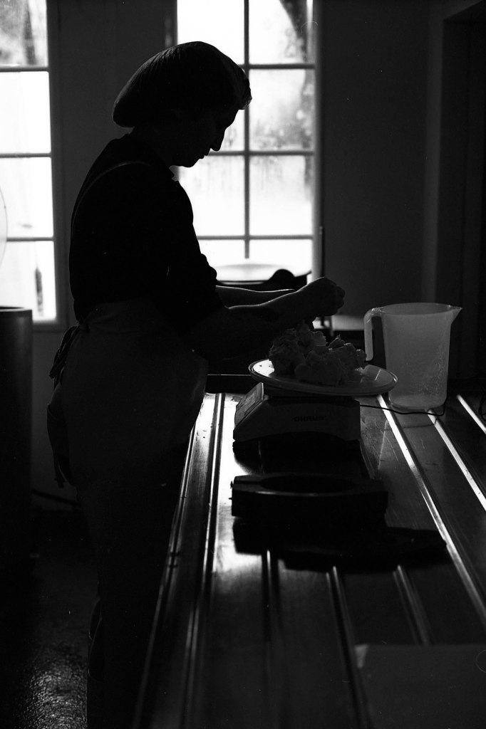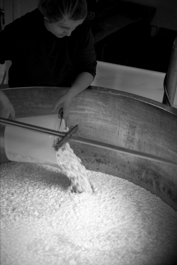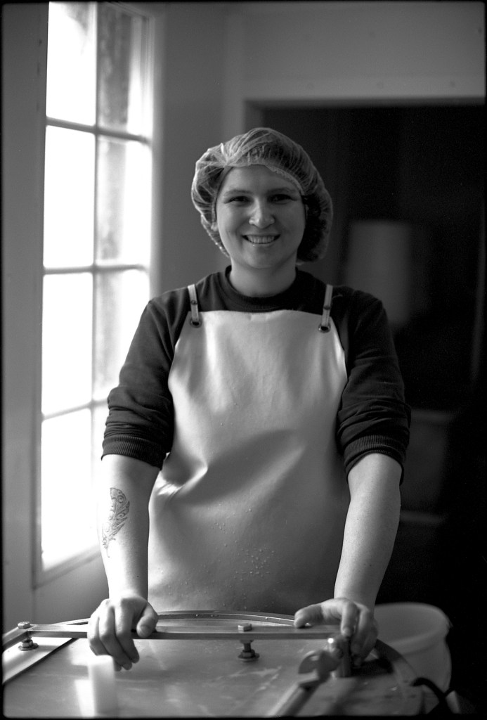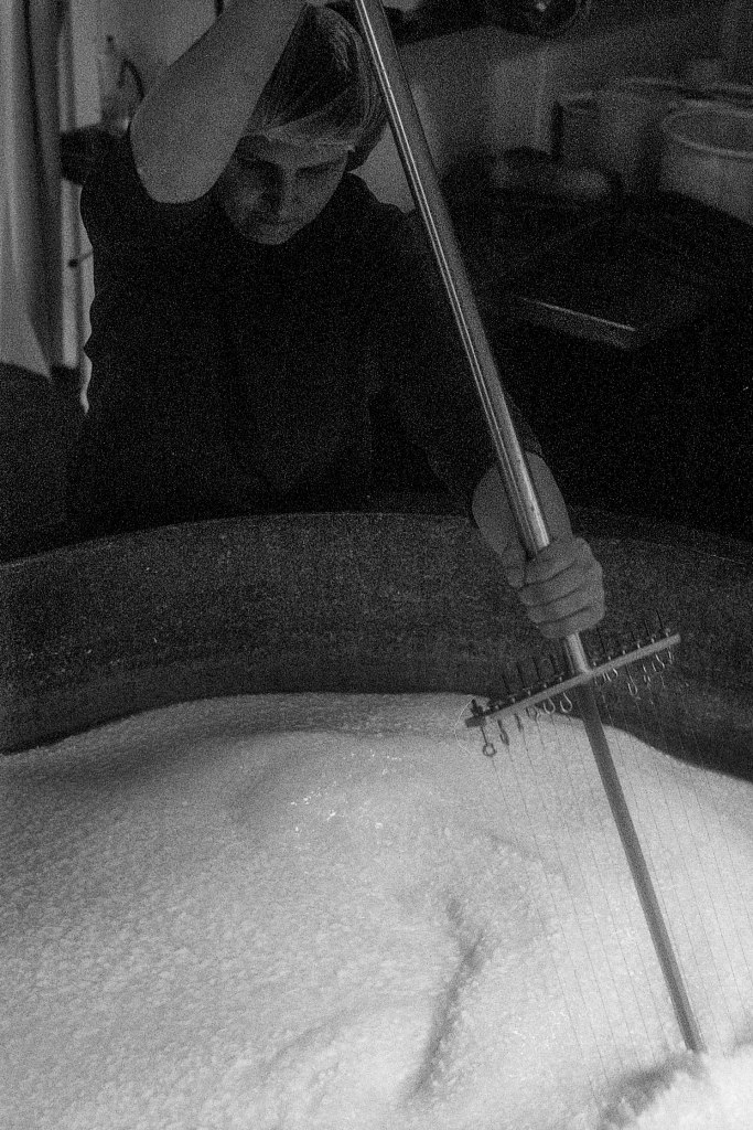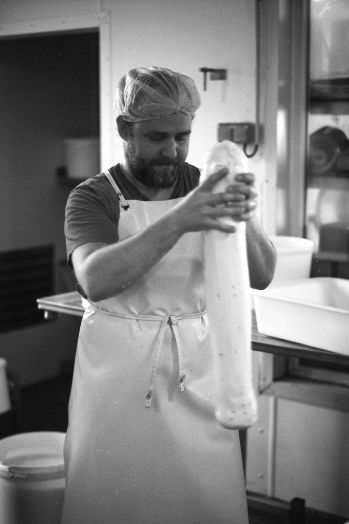 La baratte tourne, Anna façonne le beurre. Peu à peu, la crème se sépare du babeurre et se solidifie. Quelques jours plus tard, elle sera moulée avec un poussoir à saucisses, une technique singulière, propre aux fromagèr·e·s de La Rousselière. Plus loin, dans la grande cuve en cuivre surnommée « Big Mama », à l’aide du brasseur et de ses pales, le lait commence sa transformation. Après caillage, décaillage, égoutage et moulage, il devient fromage. Dans son moule, il sera pressé, et retourné jusqu’à trois fois pour y extraire les derniers résidus d’eau. Parfois, Beaudoux le découpe en fines tranches qu’Anna plonge dans une eau brûlante pour le filer, tandis que Jeremy y incorpore ail noir, fenugrec, fleurs, herbes, pistaches ou épices. Dans un dernier geste, ielles embossent la pâte dans un filet avant de la plonger dans l’eau froide.