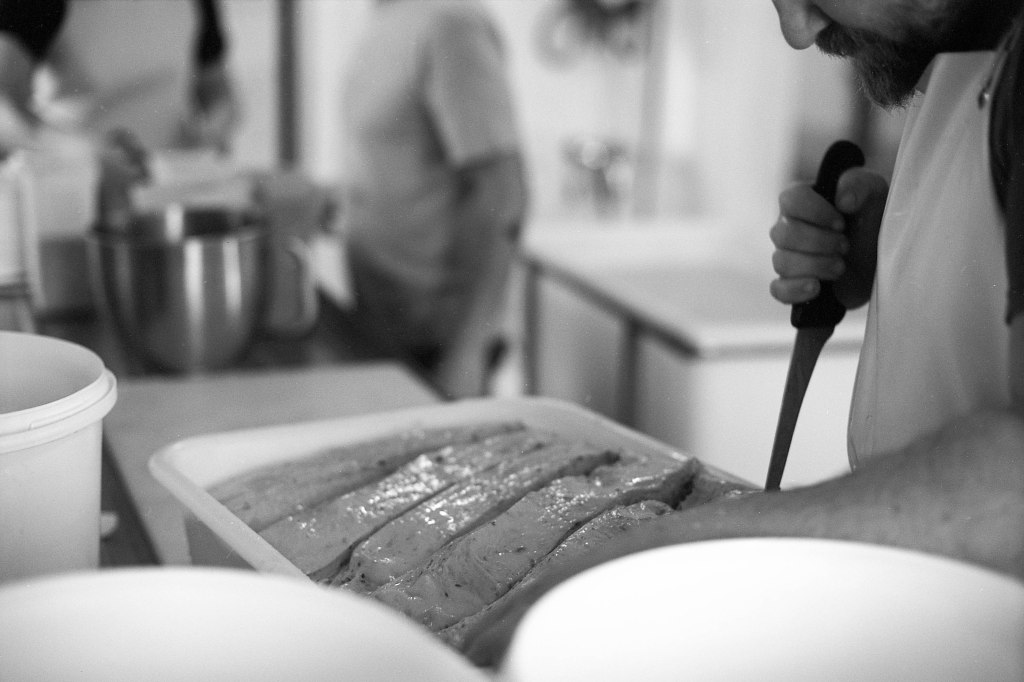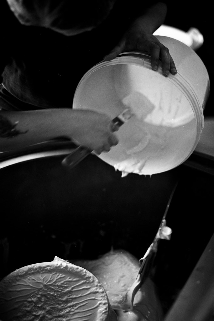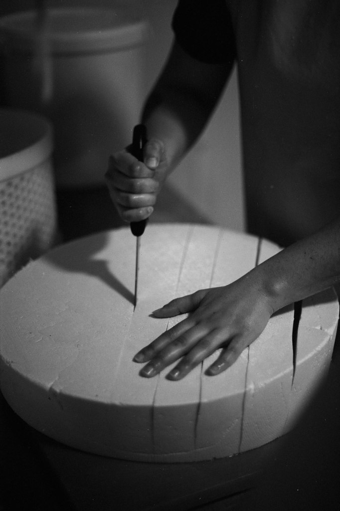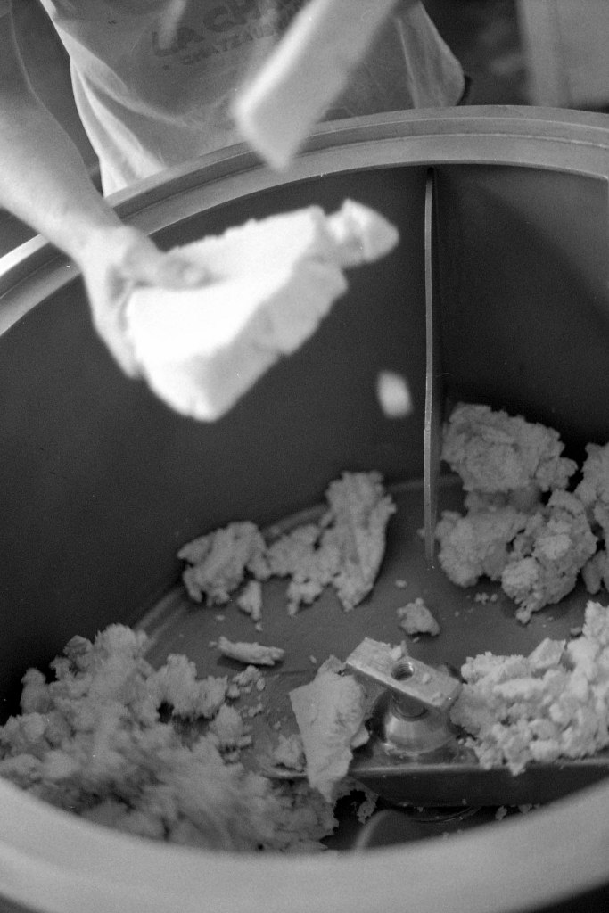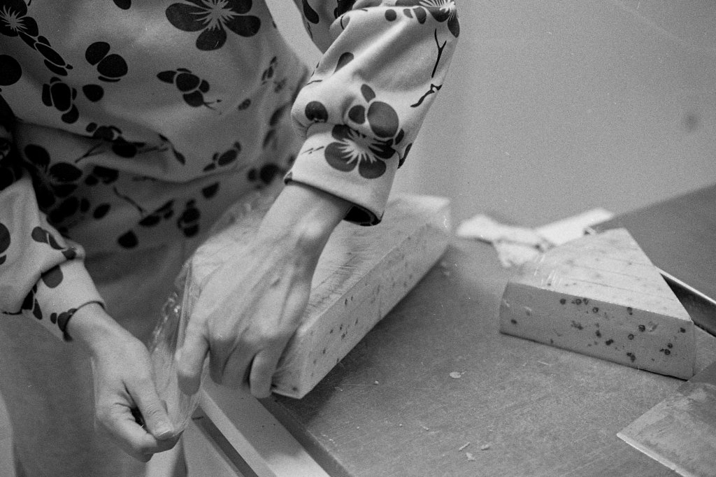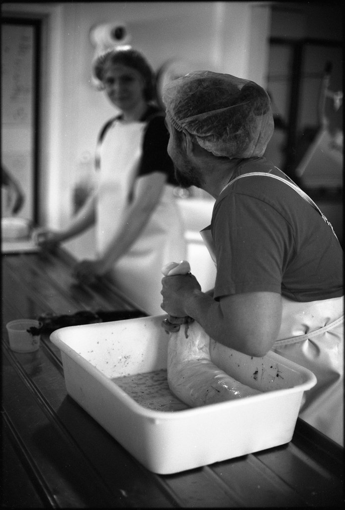 La baratte tourne, Anna façonne le beurre. Peu à peu, la crème se sépare du babeurre et se solidifie. Quelques jours plus tard, elle sera moulée avec un poussoir à saucisses, une technique singulière, propre aux fromagèr·e·s de La Rousselière. Plus loin, dans la grande cuve en cuivre surnommée « Big Mama », à l’aide du brasseur et de ses pales, le lait commence sa transformation. Après caillage, décaillage, égoutage et moulage, il devient fromage. Dans son moule, il sera pressé, et retourné jusqu’à trois fois pour y extraire les derniers résidus d’eau. Parfois, Beaudoux le découpe en fines tranches qu’Anna plonge dans une eau brûlante pour le filer, tandis que Jeremy y incorpore ail noir, fenugrec, fleurs, herbes, pistaches ou épices. Dans un dernier geste, ielles embossent la pâte dans un filet avant de la plonger dans l’eau froide.
