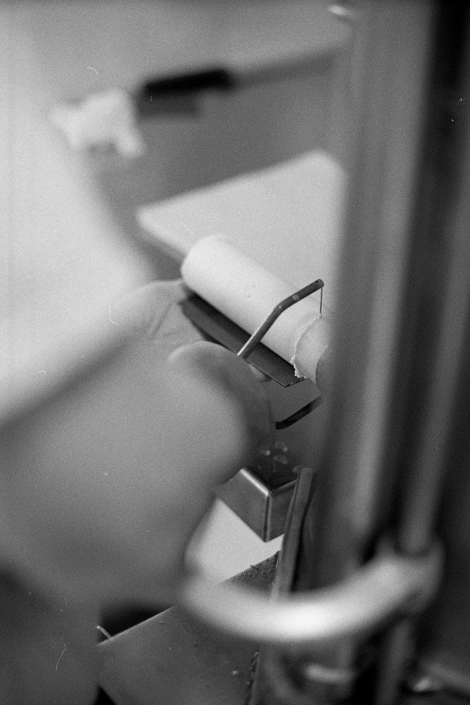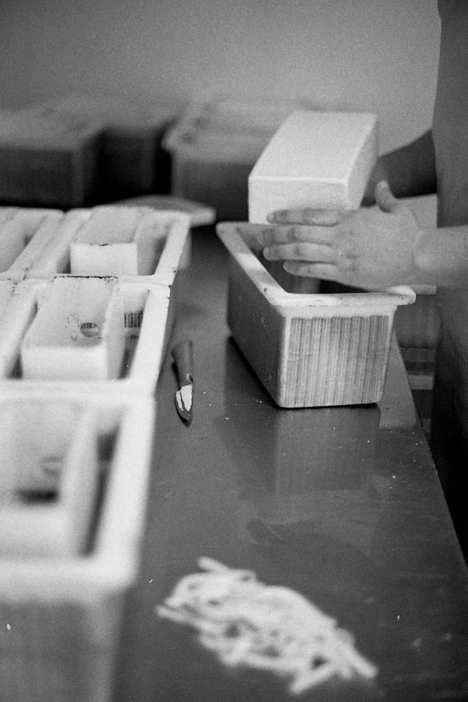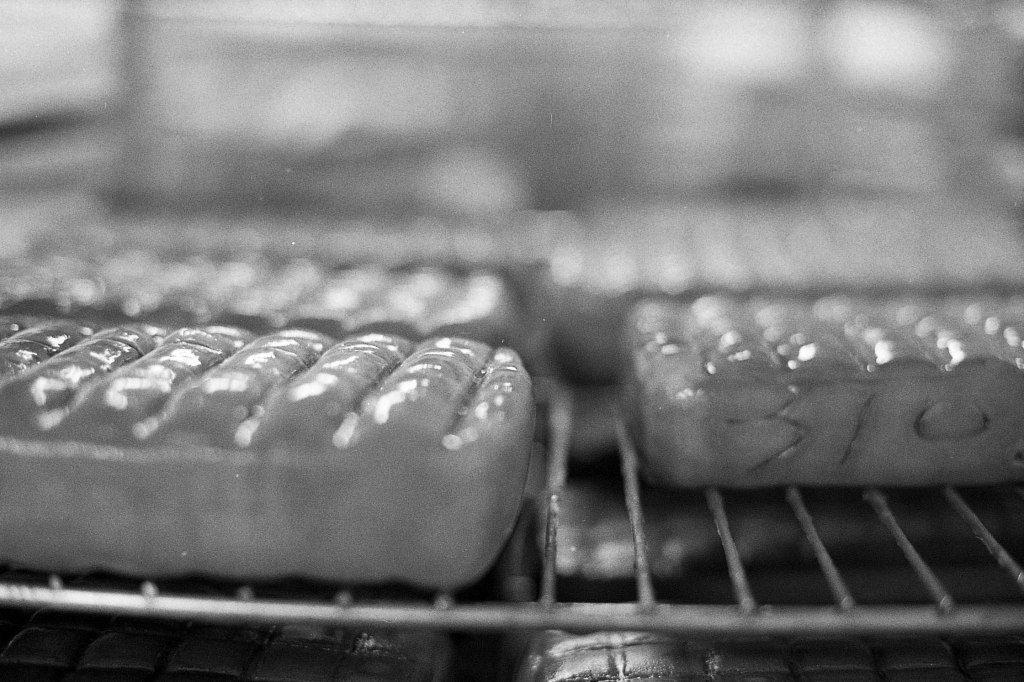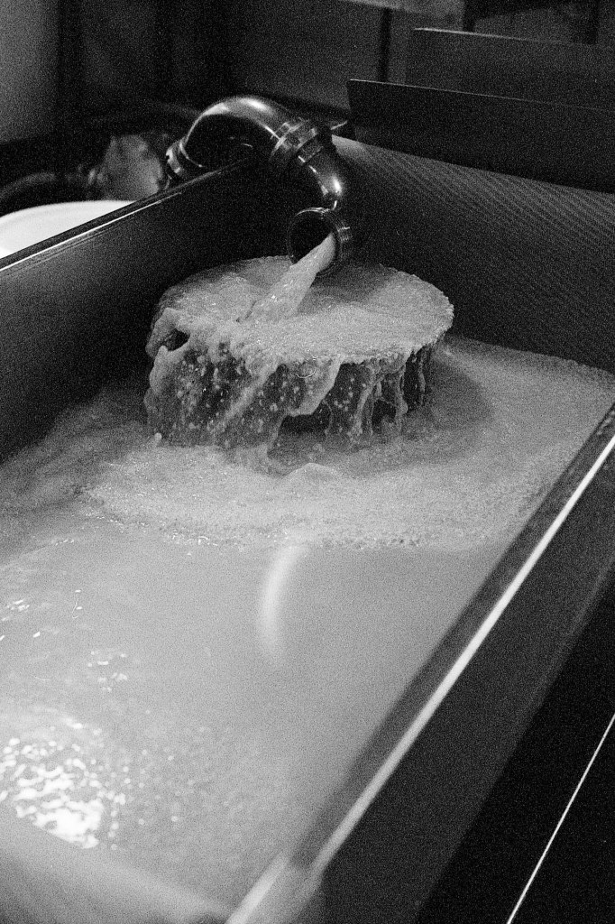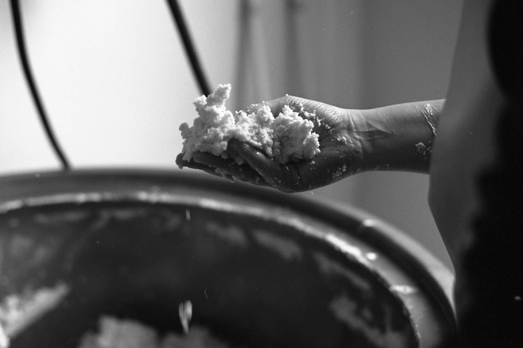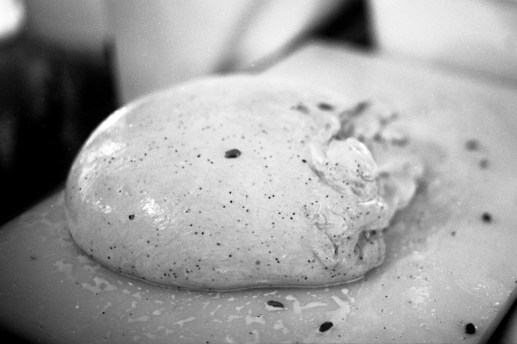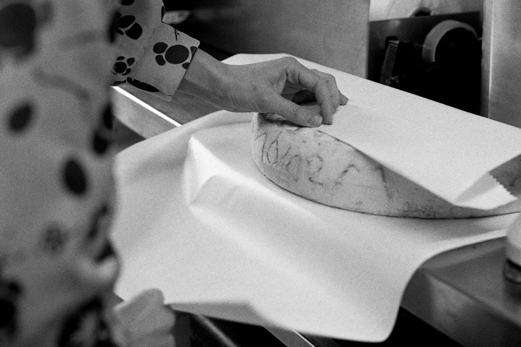 La baratte tourne, Anna façonne le beurre. Peu à peu, la crème se sépare du babeurre et se solidifie. Quelques jours plus tard, elle sera moulée avec un poussoir à saucisses, une technique singulière, propre aux fromagèr·e·s de La Rousselière. Plus loin, dans la grande cuve en cuivre surnommée « Big Mama », à l’aide du brasseur et de ses pales, le lait commence sa transformation. Après caillage, décaillage, égoutage et moulage, il devient fromage. Dans son moule, il sera pressé, et retourné jusqu’à trois fois pour y extraire les derniers résidus d’eau. Parfois, Beaudoux le découpe en fines tranches qu’Anna plonge dans une eau brûlante pour le filer, tandis que Jeremy y incorpore ail noir, fenugrec, fleurs, herbes, pistaches ou épices. Dans un dernier geste, ielles embossent la pâte dans un filet avant de la plonger dans l’eau froide.
