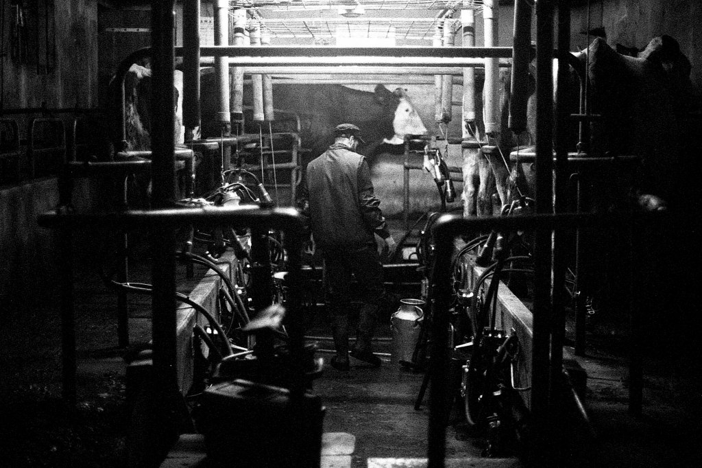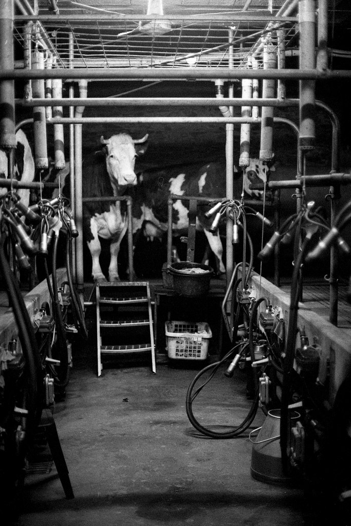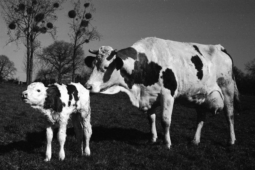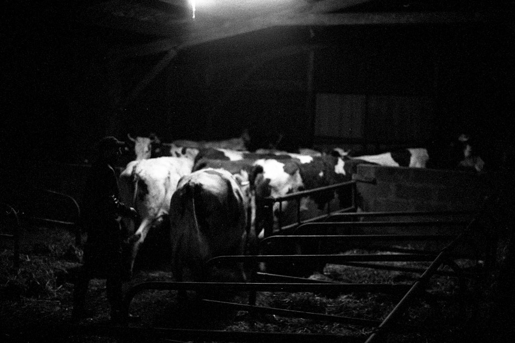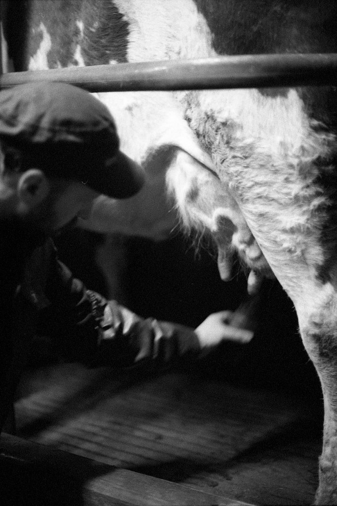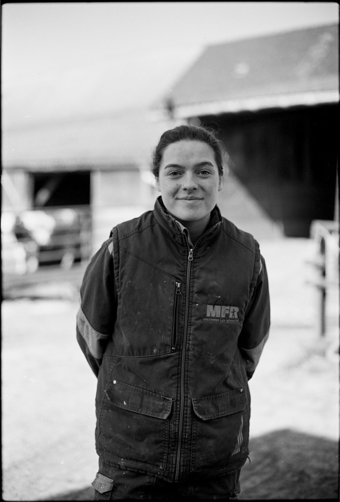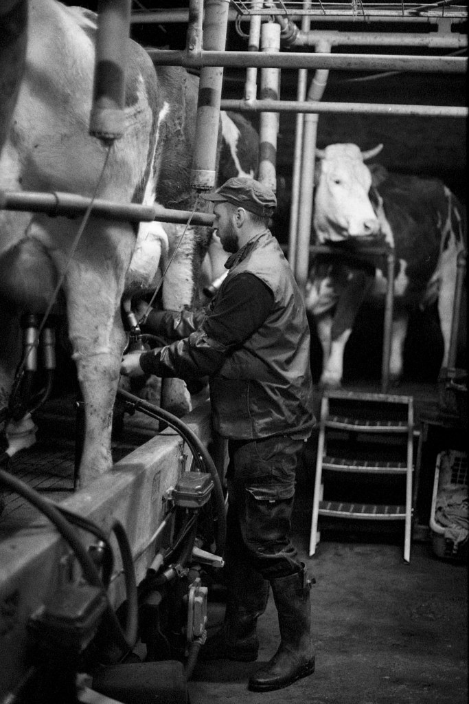 Il est 7 heures. Bottes aux pieds, le jeune agriculteur ouvre la salle de traite, attenante à l’étable. À La Rousselière, le choix a été fait de passer en monotraite : les vaches ne sont sollicitées qu’une seule fois par jour. Ludo m’explique que cette méthode préserve davantage les animaux tout en réduisant la charge de travail. Une à une, les vaches s’avancent en rangs de cinq vers la trayeuse. D’un geste précis, il nettoie les trayons, place la griffe et la machine s’enclenche. Entre deux manipulations, il se plaît à me désigner celles que je photographie par leur nom : Tourna, Triumph, Prada, Tabasco. Dans une ronde timide, Ludo leur rappel régulièrement de venir s’installer. Seulement trente-trois d’entre elles sont à l’étable ce matin. Les autres, retirées à l’abri des regards, attendent le moment du vêlage. Pour la plupart, elles mettront bas en solitude, dans le silence feutré d’un pâturage à l’abri des regards.