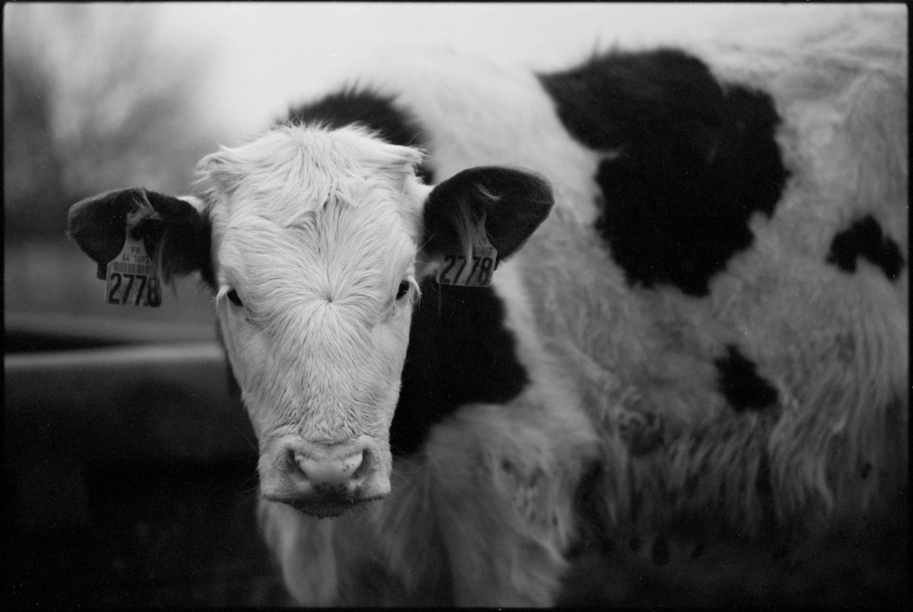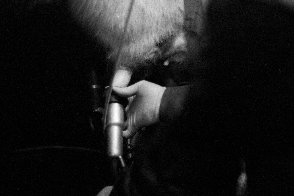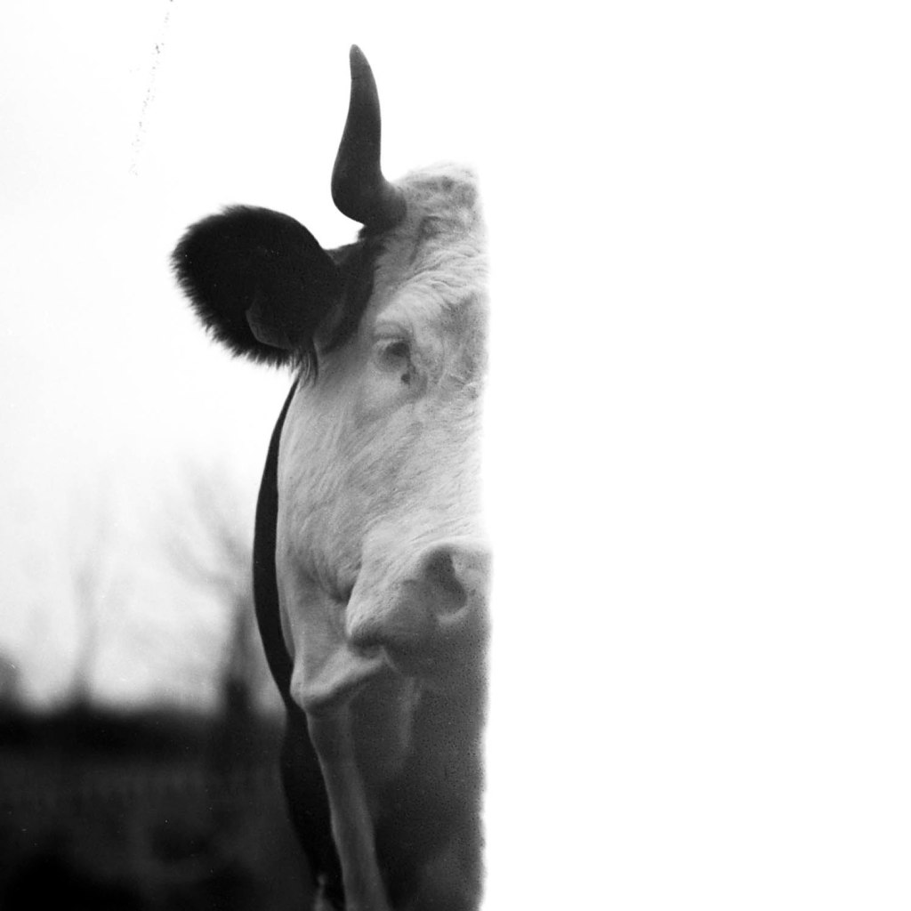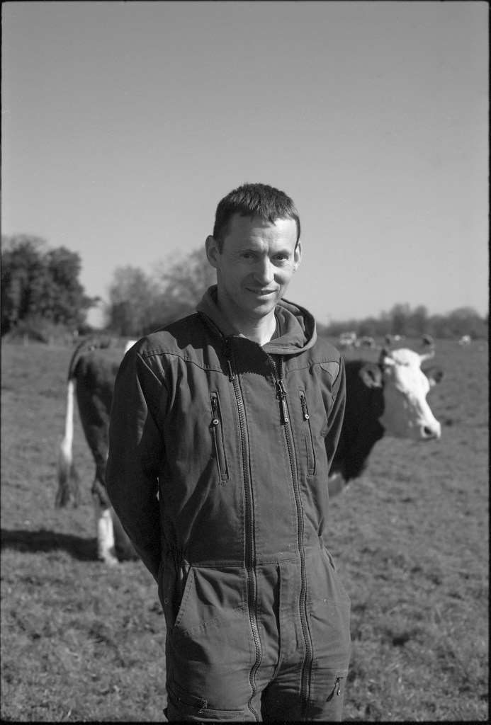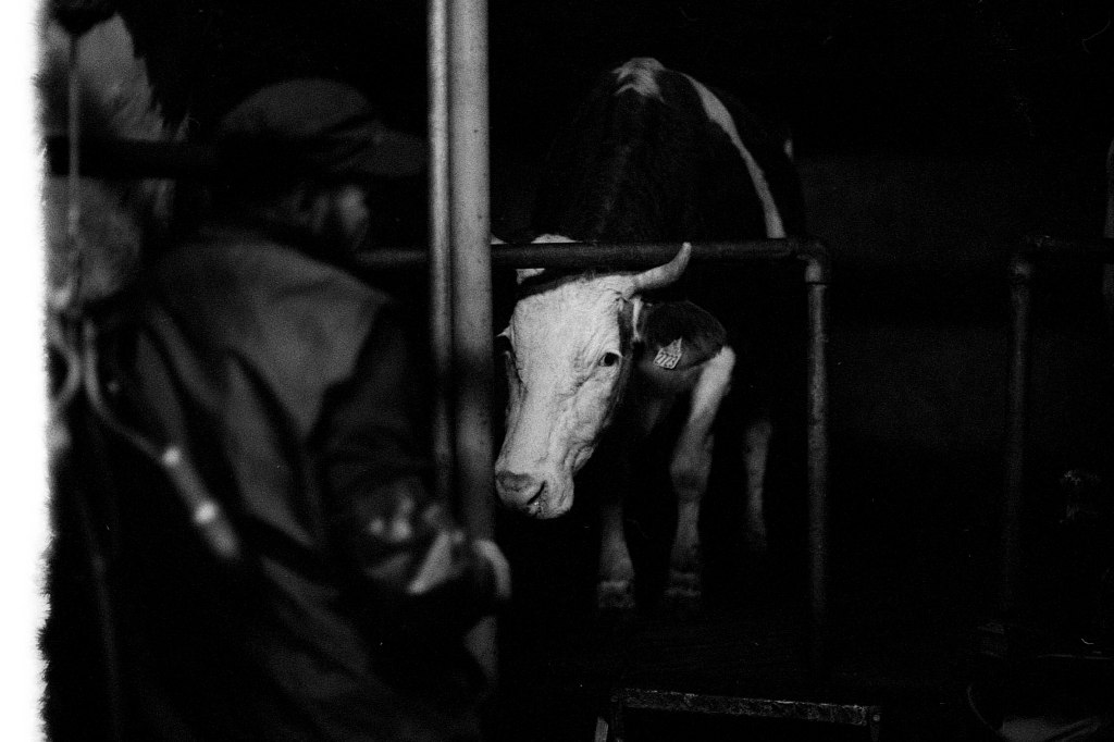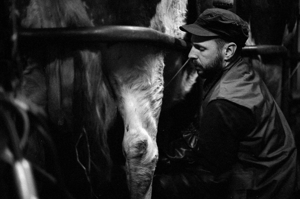 Il est 7 heures. Bottes aux pieds, le jeune agriculteur ouvre la salle de traite, attenante à l’étable. À La Rousselière, le choix a été fait de passer en monotraite : les vaches ne sont sollicitées qu’une seule fois par jour. Ludo m’explique que cette méthode préserve davantage les animaux tout en réduisant la charge de travail. Une à une, les vaches s’avancent en rangs de cinq vers la trayeuse. D’un geste précis, il nettoie les trayons, place la griffe et la machine s’enclenche. Entre deux manipulations, il se plaît à me désigner celles que je photographie par leur nom : Tourna, Triumph, Prada, Tabasco. Dans une ronde timide, Ludo leur rappel régulièrement de venir s’installer. Seulement trente-trois d’entre elles sont à l’étable ce matin. Les autres, retirées à l’abri des regards, attendent le moment du vêlage. Pour la plupart, elles mettront bas en solitude, dans le silence feutré d’un pâturage à l’abri des regards.