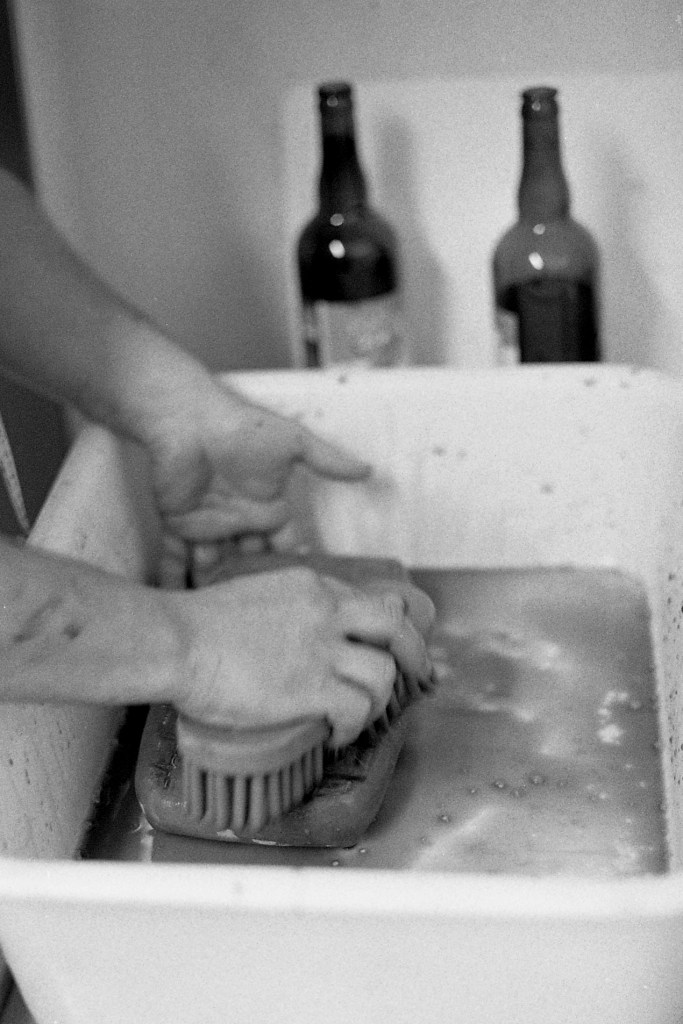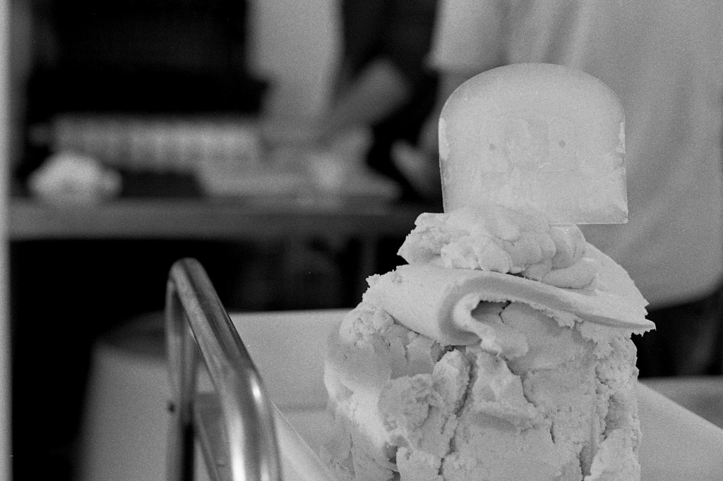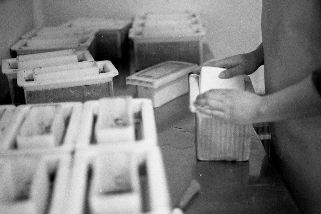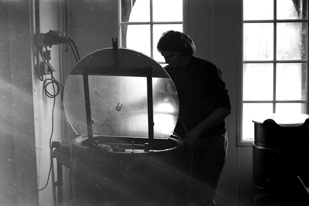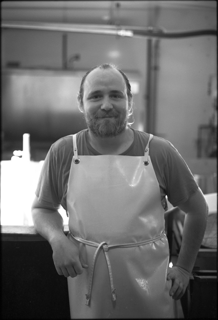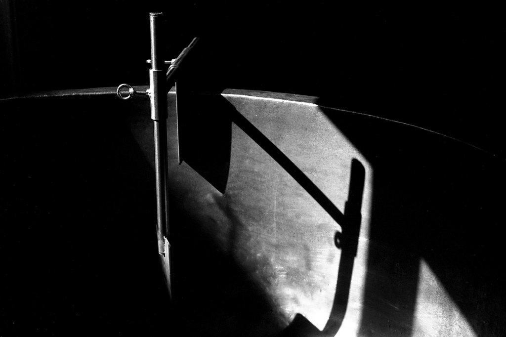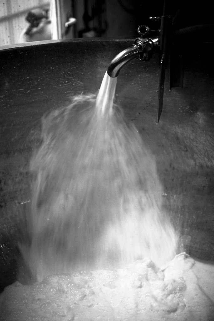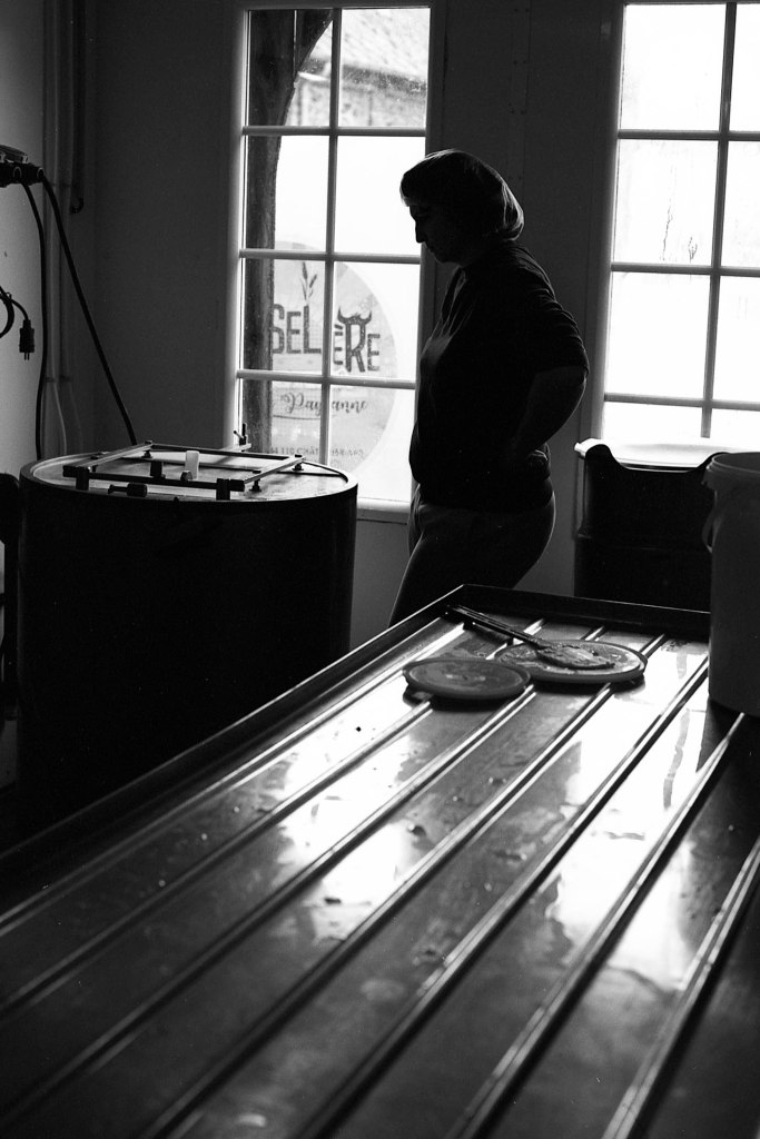 Derrière une autre porte, l’atelier principal regorge d’ustensiles : bassines, baratte, cuve en cuivre, éviers, tuyaux, pales, brasseur, moules… Un joyeux capharnaüm orchestré par Jeremy, Anna et Beaudoux.