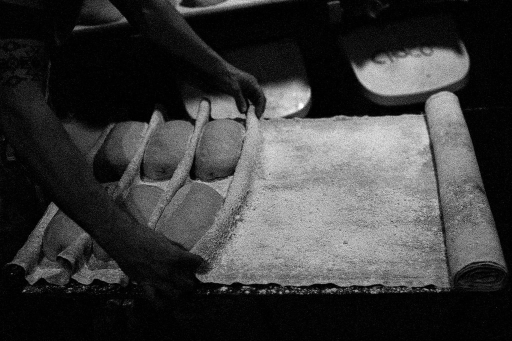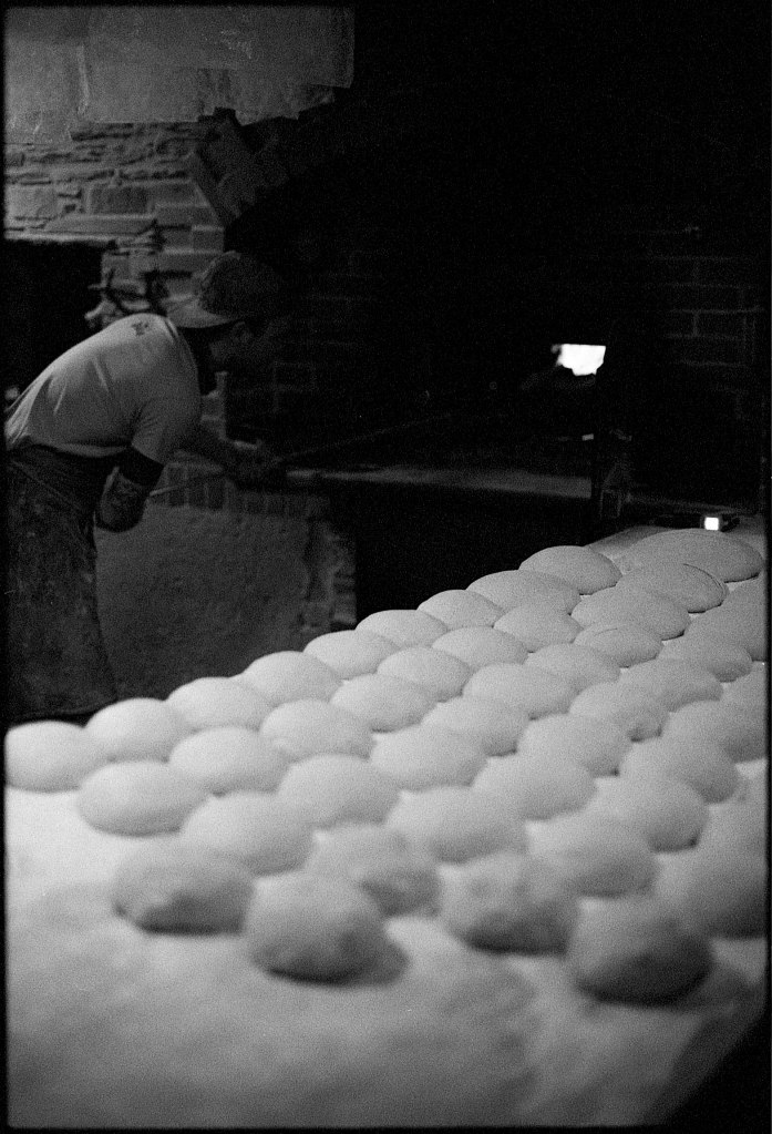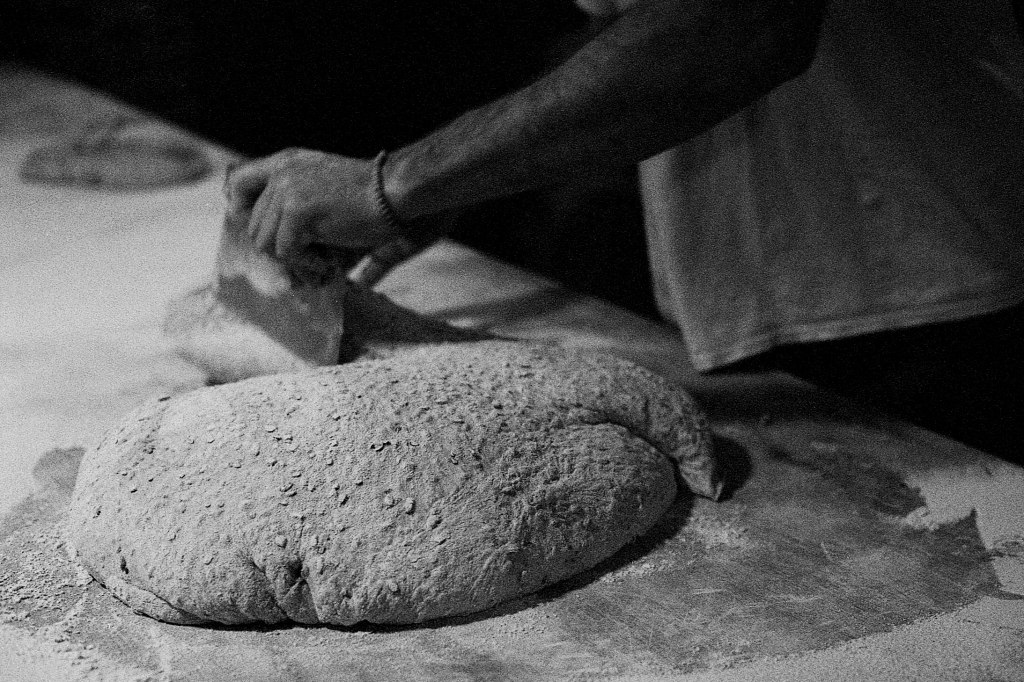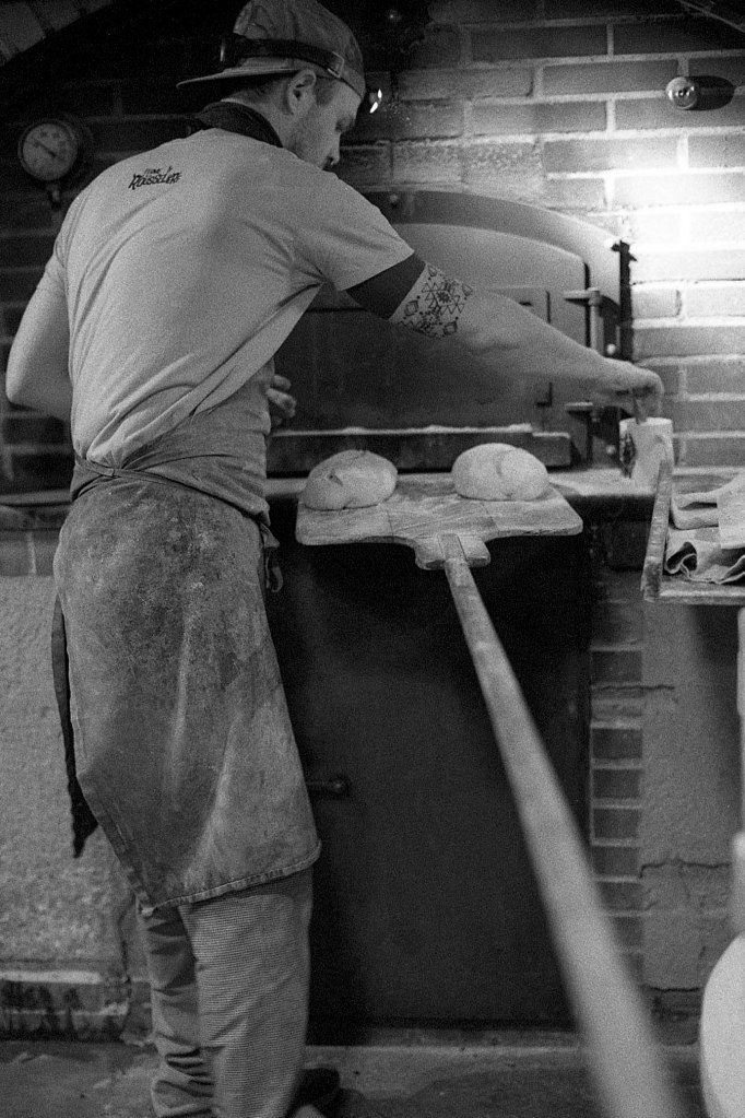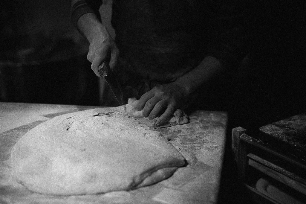 Seul le murmure du vent trouble encore la nuit, mais là-bas, une lueur chaleureuse perce l’obscurité. Il est 4h30. Derrière les vitres du fournil, une poussière de farine danse dans la lumière tamisée. Aurèle est déjà à l’œuvre, bercé par des airs d’opéra qui emplissent l’atelier. La veille, les préparatifs ont commencé : pesées minutieuses, mélanges, premières fermentations. Ce matin, les gestes s’enchaînent dans une chorégraphie bien rodée : pétrir, façonner, mouler. Pendant ce temps, le four à bois, nourri avec régularité, grimpe lentement vers les 250°C nécessaires à la cuisson.