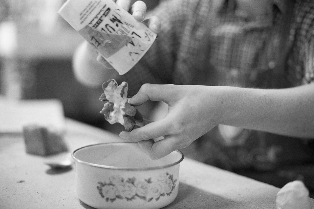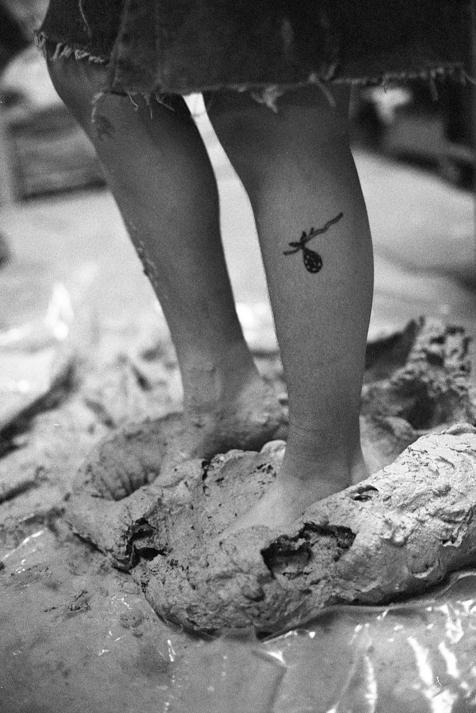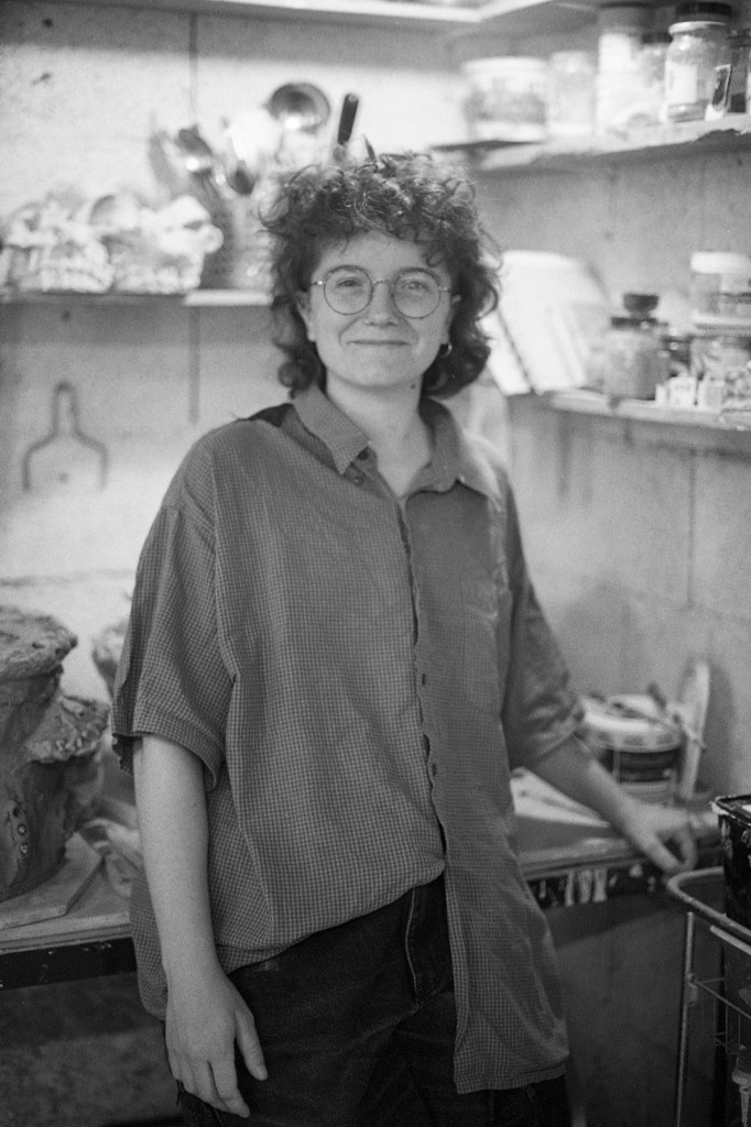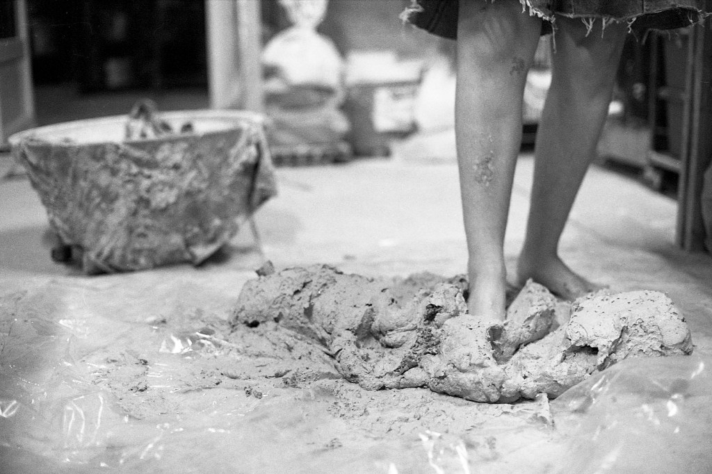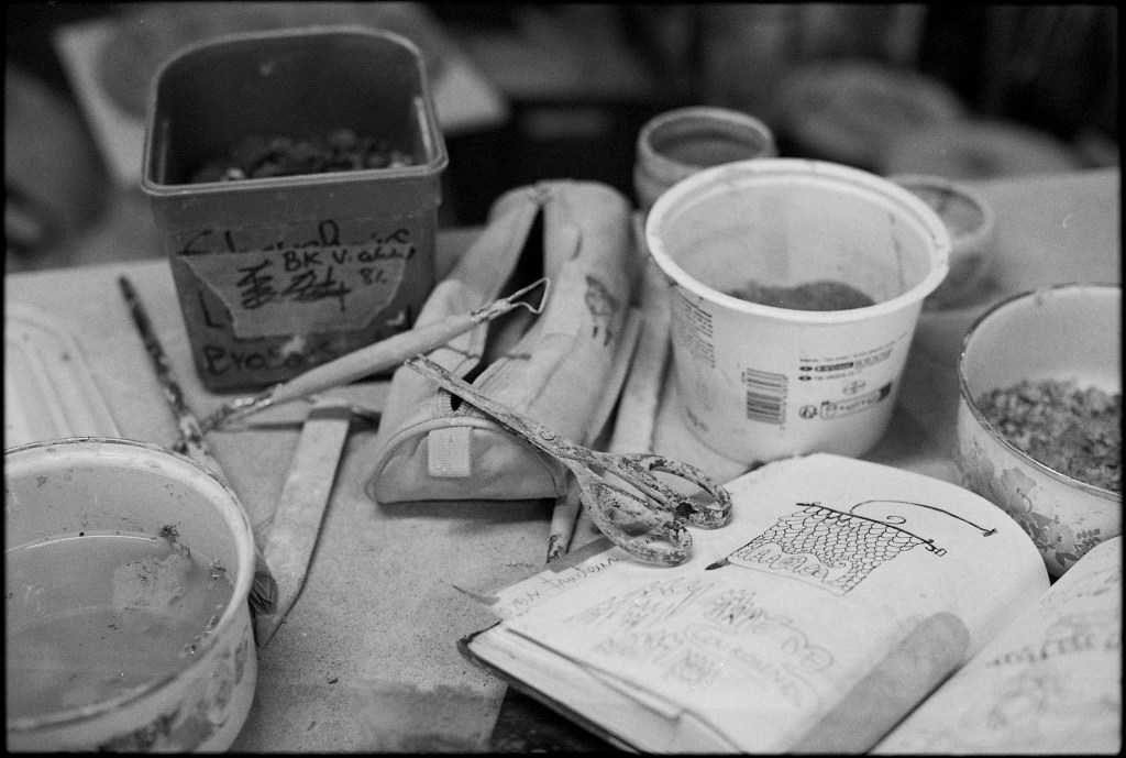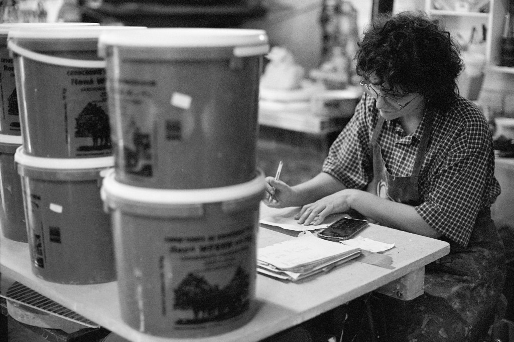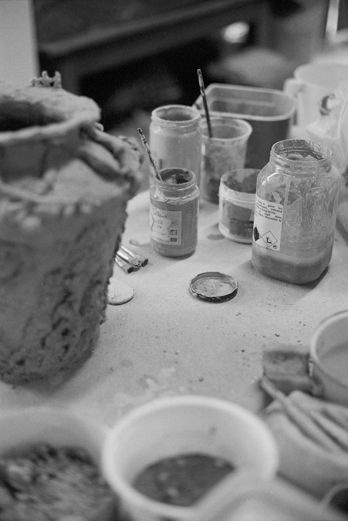 Lorsque je franchis le seuil de la seconde pièce, un long plan de travail central s’impose immédiatement à mon regard. Autour de lui s’organisent trois postes envahis d’une joyeuse profusion de pots, de boîtes, d’outils, de fragments en devenir. Au sol, une large bassine retient un mélange d’eau et de terre — un limon en attente. De retour à l’atelier, Elina m’explique que cette argile détrempée pourra, une fois séchée puis malaxée, retrouver sa malléabilité et redevenir matière à création.