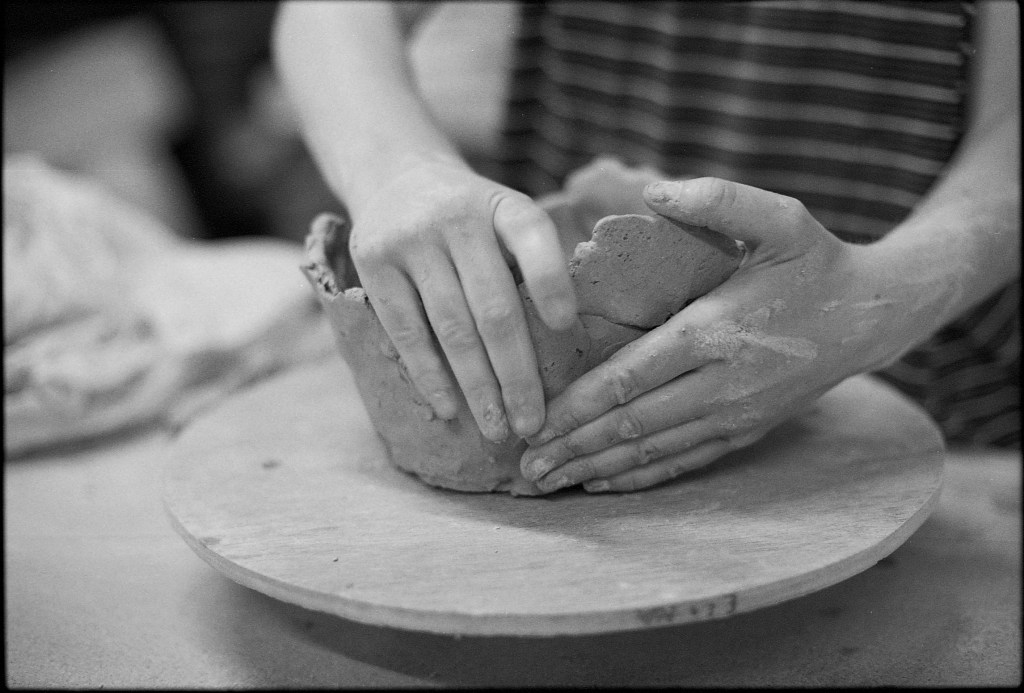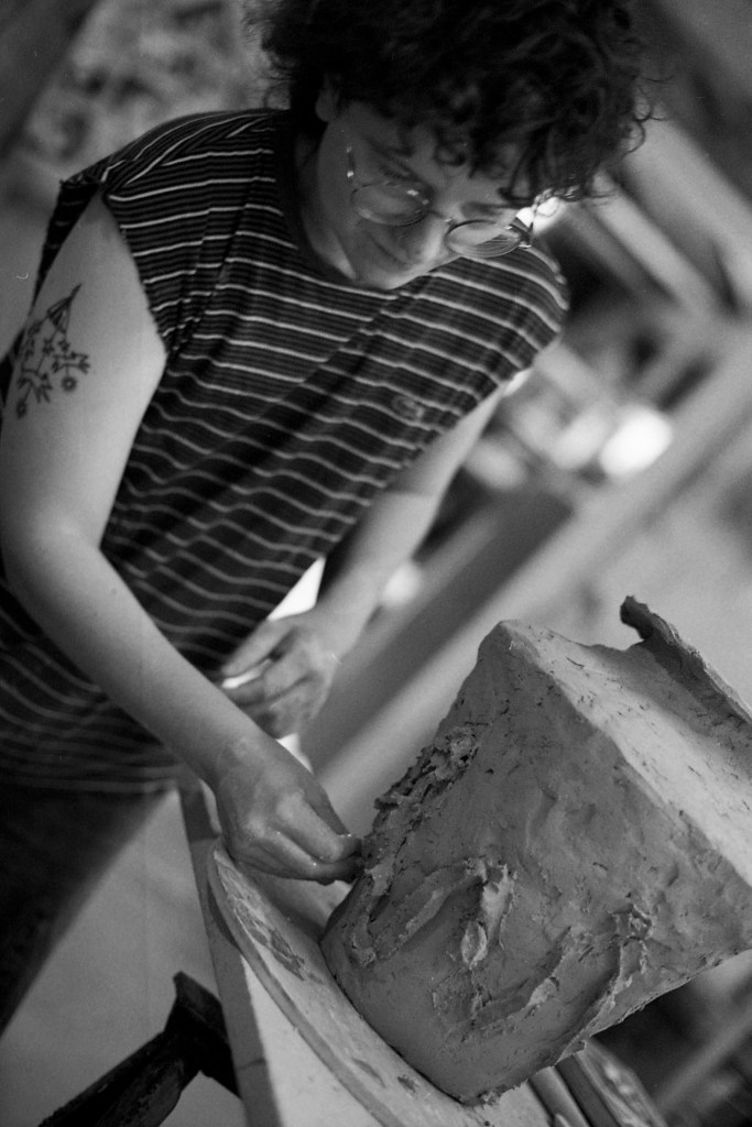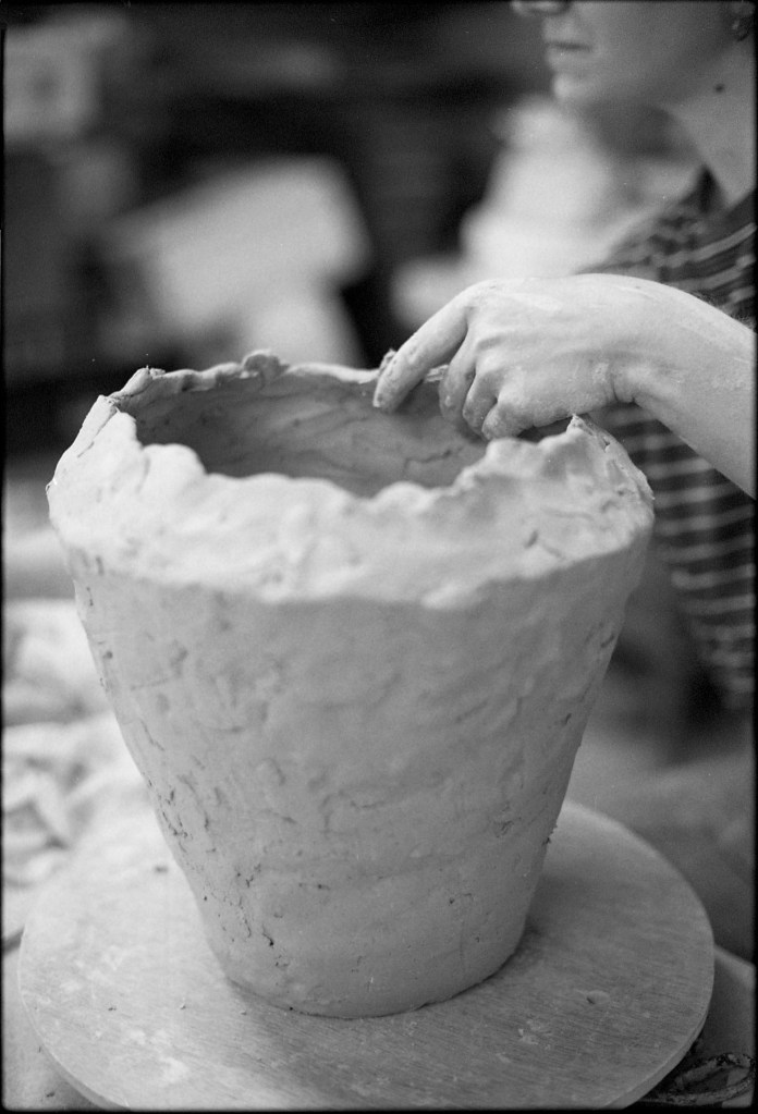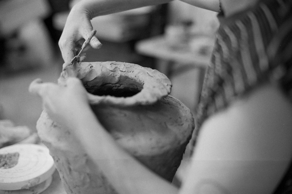 Tel un souffle joueur, une légèreté décomplexée traverse aussi son geste. Car si la création est pour Elina un terrain d’exploration sensible, elle est tout autant un espace de plaisir, de liberté. En traçant les lignes de son décor, en posant les pierres qui viendront ponctuer son pot, elle s’interrompt soudain, contemple ce qu’elle vient de d’apposer avec un sourire complice : « Ça, je vais le garder, parce que c’est vachement fun », lance-t-elle. Loin d’un rituel figé ou d’une quête sérieuse de perfection, son travail est aussi affaire de joie, d’instinct, de spontanéité. La terre, entre ses mains, devient un terrain de jeu où l’on tente, l’on ose, l’on s’amuse — sans jamais trahir la profondeur du geste.