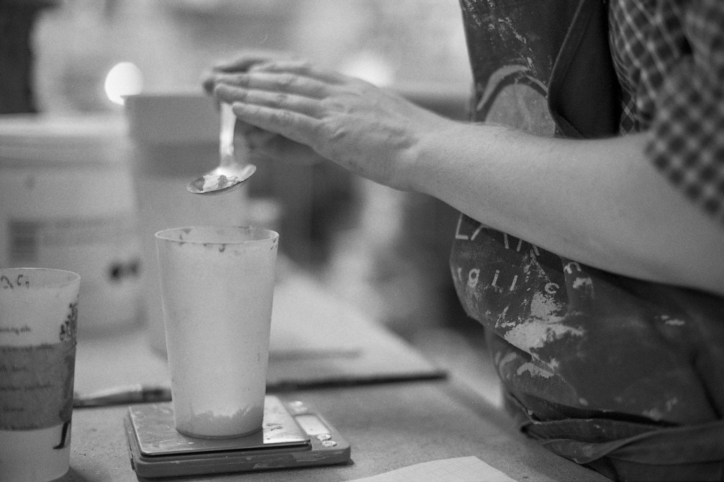 Observer Elina à l’œuvre évoque quelque chose de l’enfance : la simplicité apparente des gestes, l’aisance du corps qui crée sans retenue, la joie presque instinctive qui affleure dès qu’elle plonge les mains dans la terre. Mais très vite, à la densité des explications qu’elle partage avec passion, je comprends que ses pièces ne naissent ni du seul plaisir spontané, ni du hasard. Une fois le décor posé, l’engobe appliqué, et avant la première cuisson — le biscuitage — vient l’étape de l’émail. Elina explore de nouvelles compositions. Elle délaisse alors un instant la spontanéité du façonnage pour enfiler une autre casquette, plus analytique : recettes étalées, calculette à portée de main, balance prête à peser les moindres grammes. À partir d’oxydes et de colorants méticuleusement choisis, elle élabore les formules qui donneront leur éclat final à ses pièces.